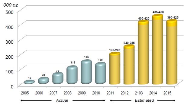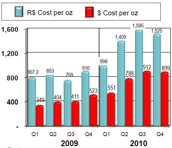 You can see the dip in production in 2010. This was not supposed to happen. It happened because of problems at Turmalina. Costs rose too high and grades fell. See the chart below and note the escalation in costs on a per ounce basis: