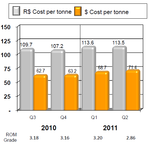 It appears that the worst is over for Turmalina. Costs in Brazilian Real were constant with Q1. Feed grade was reasonable at 3.3g/t. Below are Turmalina’s operating results.