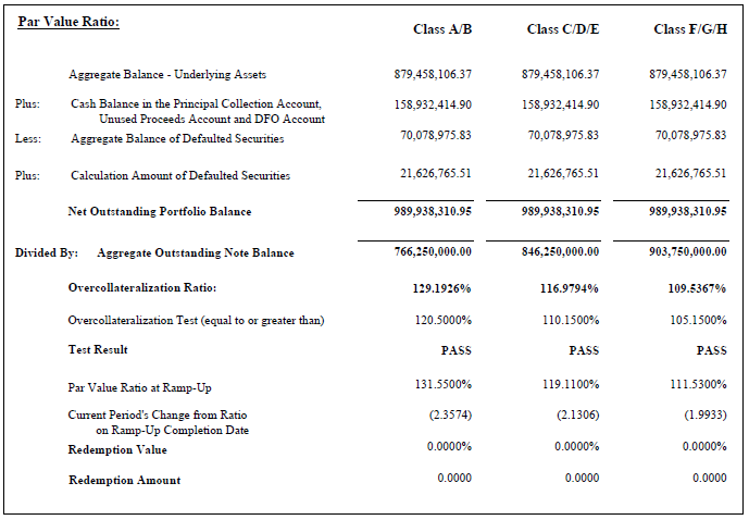 Both of these tests are straightforward and are exactly what their names suggest. In the case of the overcollateralization test all of the assets currently held by the CDO are added up, any delinquent assets are given a recovery value, and that number of total assets is divided by the amount of notes that has to be repaid. This is done for the various tranches, so for the lower tranches the upper tranches are included in the amount because they will be paid first. Thus, the overcollateralization test for the lowest tranches (F/G/H) is the hardest to pass.