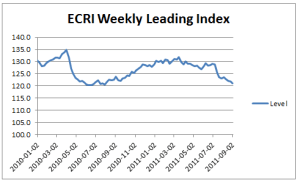 I think its worth mentioning that during the sharper but shorter downturn in the index that occured in the spring of 2010, the ECRI was adamant that this did not signal a recession. A lot of other bears did, I remember reading Rosenberg at the time and he conveniently used the WLI data to foretell a recession that never came. But the ECRI did not. I think they key difference is the “persistance” of the current move down. The index has been moving down steadily since March.