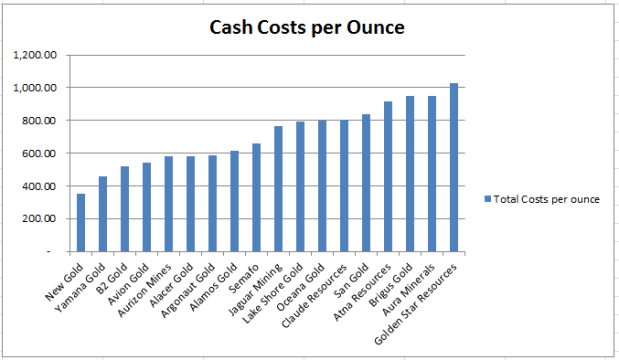 To look at the effect of overall costs, what I have done is simply this. I took the cash costs stated by each company for the last two quarters and added to those costs the additions to property, plant and equipment as reported on their cashflow statement. Then I divided summation of these two costs by the ounces produced over the first two quarters. Because PP&A is likely to be more variable, it might be worthwhile to do this over a longer time horizon, but for now this will have to suffice.