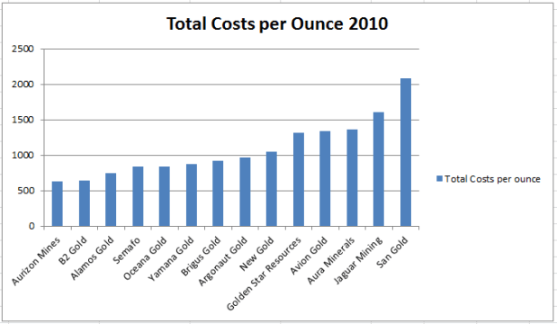 I went another step further by looking at costs for the full year 2010. That graph is shown below. Here a few of the companies (Lake Shore, Atna, Alacer, etc) drop off the list because they didn’t have comparable production for the period for one reason or another.