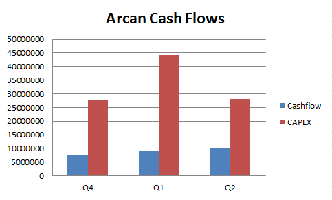 Overshadowing the production figures were the 3rd quarter capital expenditures by the company. Arcan spent a rather extraordinary $87M in the quarter. This is far and above the already high levels of CAPEX that the company spent in the previous 2 quarters. It is also far and above its cash flow. Now $24M of this capital was spent buying Stimsol, a maker of the acidizing blend that Arcan uses. But even subtracting out that sale, Arcan still spent almost $63M of capital, or 5x its current cash flow.