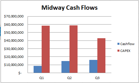 Given the future capital expenditures alluded to in the quarters report (road building, a pipeline from Ethel, remediation of the existing pipeline at Morse Unit, waterflood at Ethel), one has to expect this trend to continue going forward. To be fair though, the recent debt and equity offering the company made does give them the money to fund these expenditures.