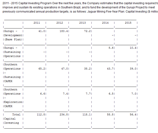 At the beginning of the year Jaguar provided a longer term outlook of what to expect from the company. I’ve provided one of the tables from this outlook below. Pay particular attention to the requirements of Gurupi (which as the table indicates was supposed to start development this year, by the way), an estimate that one analyst on the conference call referred to as outdated and not in the “that number is too high” kind of way.