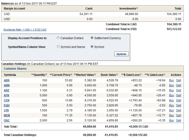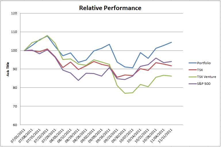 Last week was another good week for my portfolio. I tend to perform well in sideways markets. In down markets, especially those like we’ve had recently where the correlation of all asset classes go to one, I tend to underperform on an individual equity basis, because the stocks I own are for the most part small caps and commodity stocks, and they get hit harder than the broader market. I’m trying to mitigate that with my currently high cash position, and it has done its job and dampened the effect.
