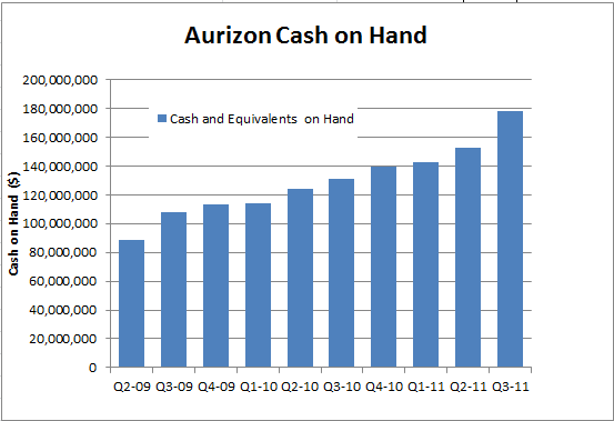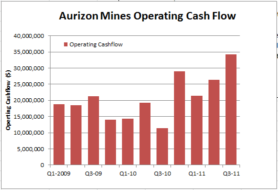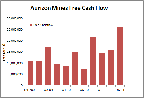 If you annualize the third quarter, where the realized gold price for Aurizon was $1695/oz, the company is generating $104M in free cash a year.  This puts the companyvaluation at a little less than 7.5x free cash flow.