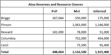In the analysis I will post later I will get deeper in the net asset value of the company, but for now consider the following table. With Atna, for a price of about $100M enterprise value, you are getting around 5Moz of total resource, of which the majority is either very high grade (Pinson) or has open pit heap leaching potential (Briggs, Reward, Cecil). All to be had for $20/oz.