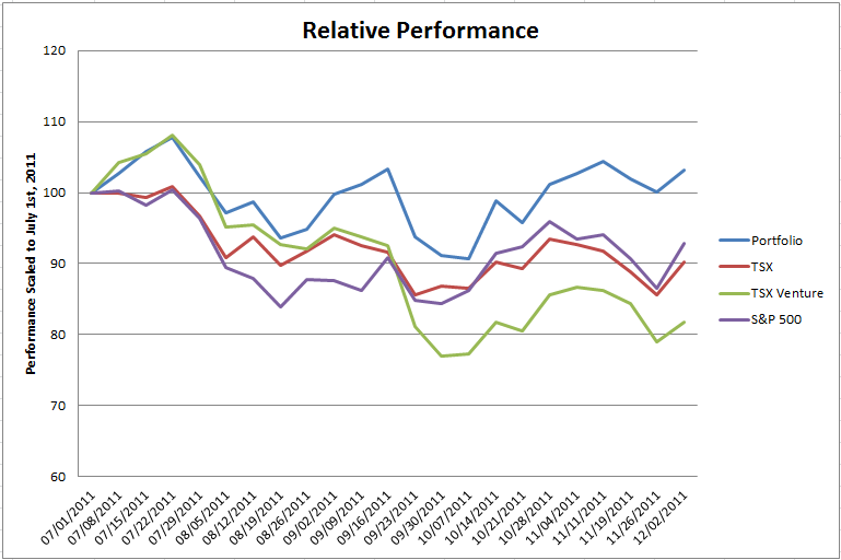 That is exactly what happened this week. The TSX was up 5%, the S&P up 6%, the Venture up 3.3%, and my portfolio was up a lowly 2.9%. Having as much cash as I do certainly has protected me against the downward trend over the last 4 months, but it will also prevent my portfolio from having outsized gains if we have a significant rally.