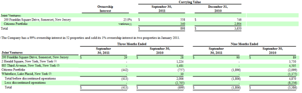 The joint venture 200 Franklin Square Drive, Somerset, New Jersey is carried at $558,000. Yet income from the property was $29,000 in Q3 and $90,000 for the first 3 quarters. So based on its book value it is returning 20%. I think the book value needs to be higher.