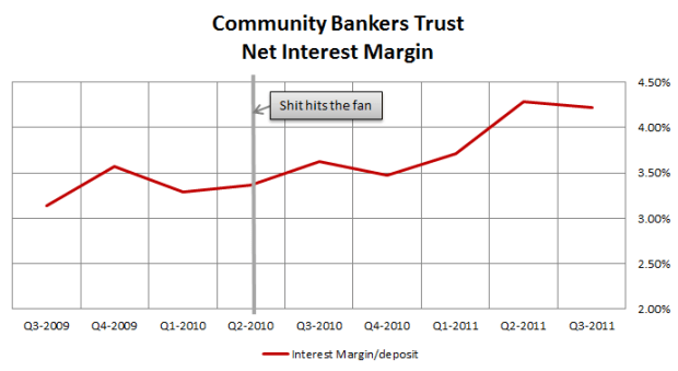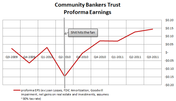 I bought BTC as a turnaround story. Community Bankers Trust is a bank that has been trying to reincarnate itself after the first incarnation came close to an early death. My observation is that they have been successfully navigating this resurrection, and with the recent turn in profitability (and a helpful turn in the economy) the bank is on its way to realizing its earnings potential.