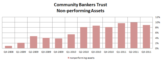 The bank was hit hard by the recession in 2009. The company saw nonperforming loans skyrocket from 2% of total loans in the first quarter of 2009 to 10% of total loans in the second quarter of 2011. Yet there have been signs that the efforts the company has been making to turn itself around are working, culminating with a profitable quarter in Q3.