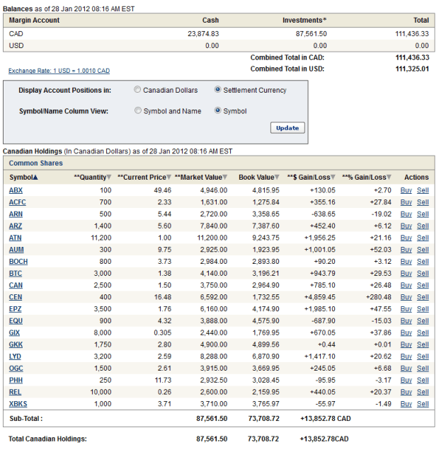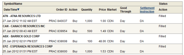 The moment I read the news I bought a position in Barrick Gold, and I added to my positions in Esperanza Resources and Golden Minerals (though I neglected to make the AUM trade in my practice account). The next day I added to OceanaGold, and thta was followed by additions to Atna and Canaco the day after that.