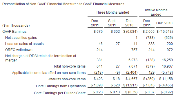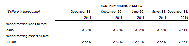 “Our goals for 2011 were to make major improvements in our problem assets and to rebuild the fundamentals of the core bank, and I am pleased to report that we accomplished our goals. Both nonaccrual loans and net charge-offs saw continual and substantial declines throughout the year. At year-end our ratio of nonperforming assets to loans and other real estate was at its lowest level since the first quarter of 2010. Additionally, the fourth quarter showed a strong increase in new loan production in our targeted growth areas. All of this occurred while we lowered noninterest expense for the year by 21%.