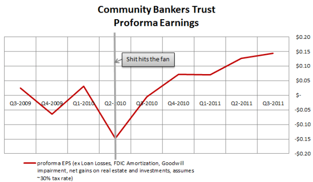 Pro-forma earnings (that is earnings before the FDIC amortization and before any one time hits to investments and real estate owned) were strong in the fourth quarter, coming in at 14 cents per share. Again I think the bank has a lot of earnings power going forward once (if) it is able to bury its past misdeeds.