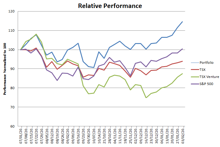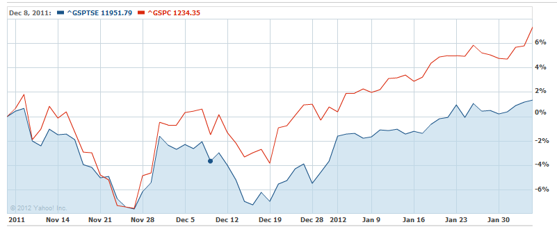 While it was another good week for the S&P and a decent week for my portfolio it was not a great week for the TSX. Again. This is becoming a pattern. Its striking how badly the TSX is underperforming so far this year. The S&P is up almost 6%, the TSX is up hardly at all.