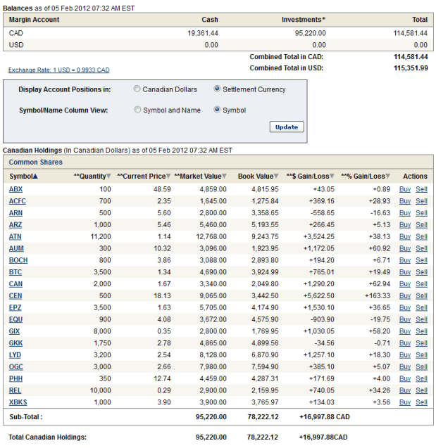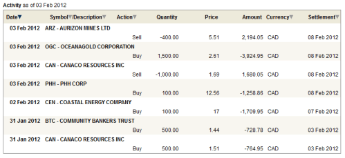 Early in the week the gold stocks and the bullion looked to be breaking out together and there was a hope (at least in my mind) that it was for real. Then the Friday employment number came out and presumably frightened everyone about the prospects of inflation and the gold price dropped 1.8%. Some of the gold stocks got hit much harder. I’m not willing to find out if this is a blip or another true correction; I reduced my trading positions in Aurizon, Canaco, and OceanaGold (though as you will note at the end of the post with respect to my weekly practice account trades, I mistakenly bought rather than sold OGC. This is something I will have to rectify on Monday).