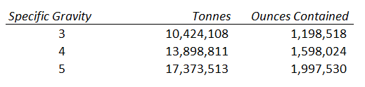 Wrong. Or at least I think so. The problem is that if I use 2.6 as my density I don’t get anywhere near as many ounces as I should. A specific gravity of 2.6 gives me a little over 1,000,000 oz of gold.