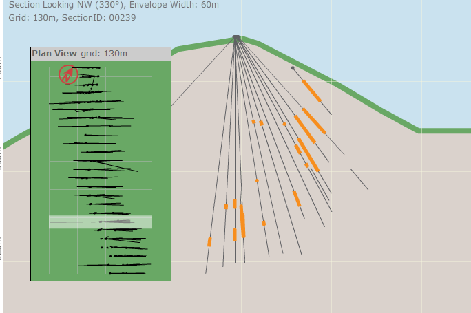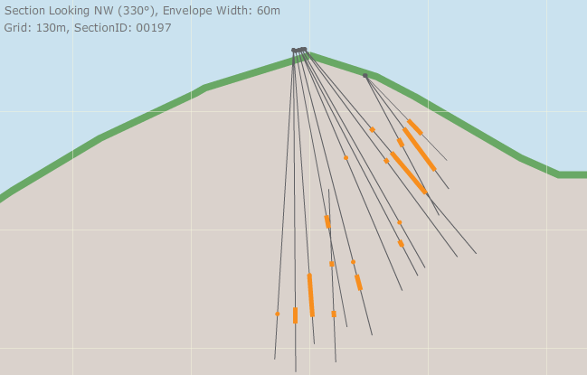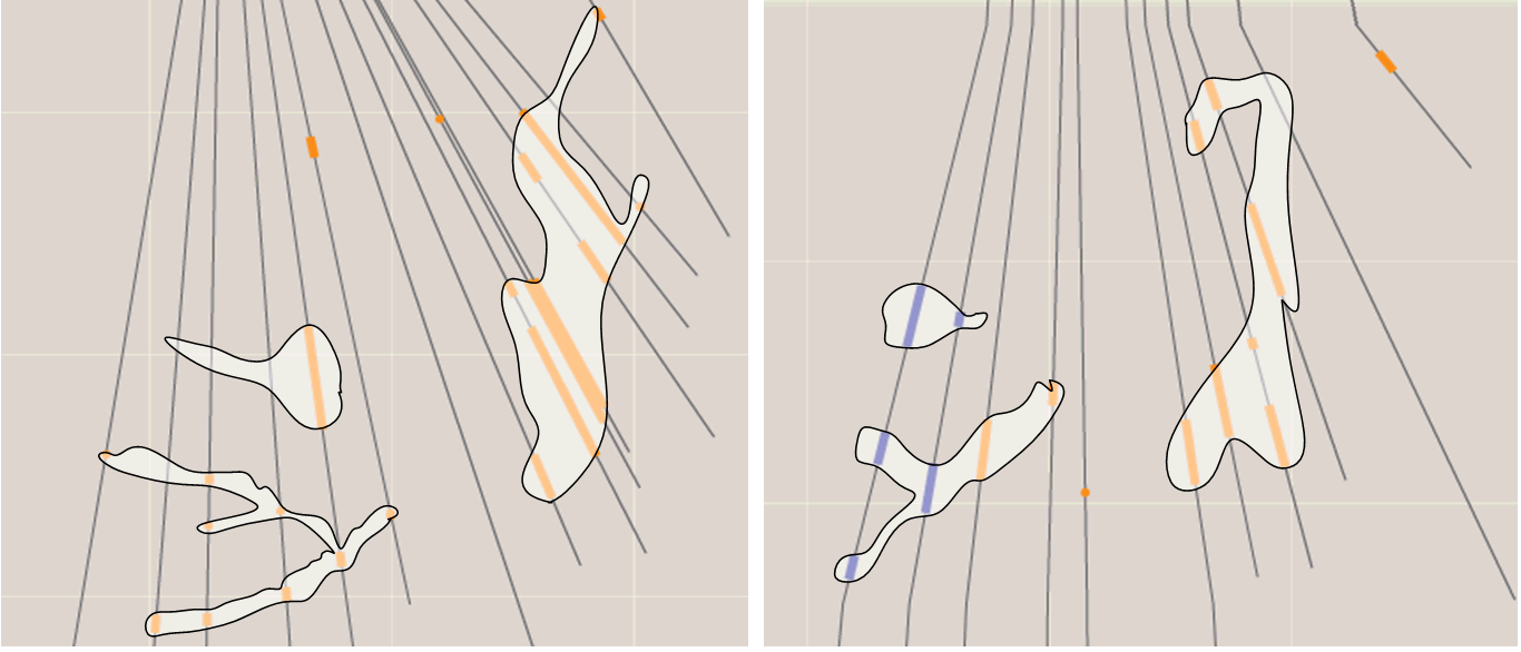 With Section 280 (on the left in both pictures) you can see a few spots where corebox wasn’t perfect; where the complete drill result wasn’t shown in the cross section. I was careful about this, and whereever there was a discontinuity where it didn’t seem there should be one I checked the actual drill results against what corebox was showing to make sure corebox didn’t miss one of the shorter or lower grade intercepts (in a few cases it did).