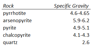 Pyrrhotite, arsenopyrite and pyrite all have much higher specific gravities then quartz.