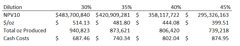 I went back over that analysis and looked at the sensitivity to dilution. Turns out that Pinson is quite sensitive to that dilutive factor. You would need to see about 45% dilution at my original grade of 0.4 oz/t to get up to $850 per ounce costs (these are the $2100 per oz gold price estimates. I used the high end number so that I could see just how big the differences in dilution could amount to in terms of NPV):