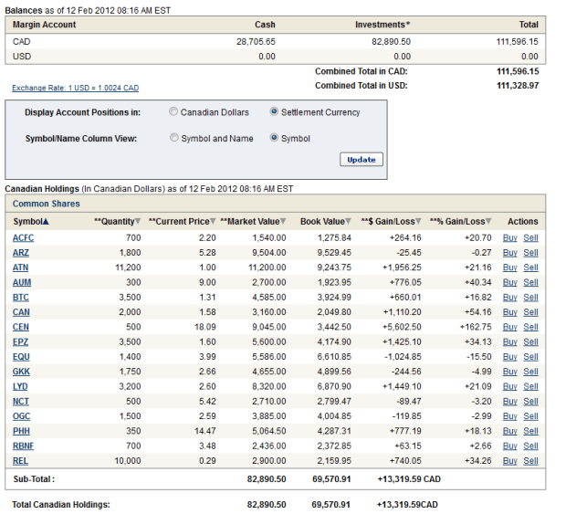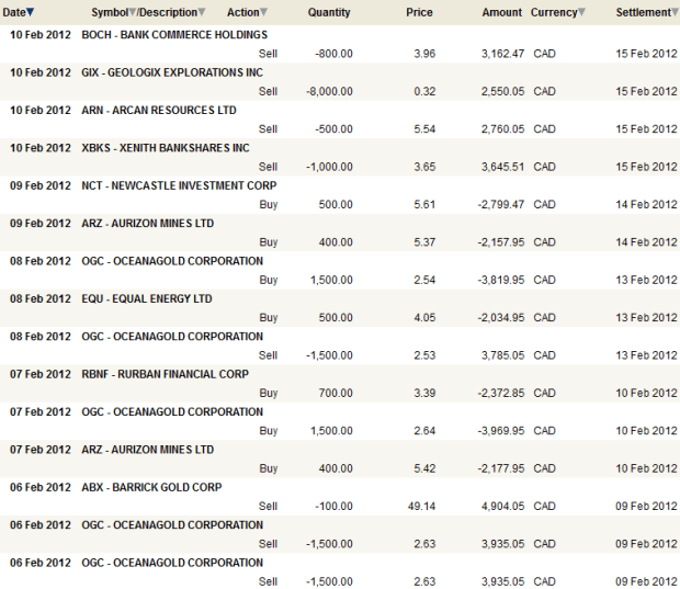 In my actual account I also liquidated Second Wave Petroleum. I came within a hairs breadth of selling OceanaGold, Golden Minerals and Canaco as well, but I decided to stick with them (for now) because it just feels to me like gold is on the verge of a move up. There may be a second leg to this sacrifice yet.