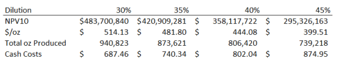 First, as I mentioned already, there is a lot of interpretation involved here, and perhaps with Visio I was making the connections between drill holes too narrow or too short. I do admit that I was consciously erring on the side of conservativeness when I drew out each section, though I didn’t think that doing so would have such an effect. I played around with this a bit to see how sensitive the resource is to changing the cross sections. Its actually not that much, not unless you start getting really creative and adding mineralization where there clearly isn’t any. If you are just tweaking the known areas to make them a bit bigger, you might be able to add 200,000 oz but you would have trouble adding more. My conclusion is that this can’t be the only issue.