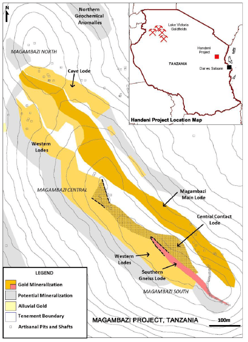 The Magambazi deposit consists of a number of zones, or what the company calls lodes, that run any where from a few hundred metres to a kilometre along strike.