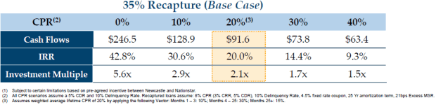 - 30% recapture rate. This means that Newcastle thinks that Nationstar can recapture 30% of the mortgages that go up for refinancing. If a mortgage goes up for refinancing and is captured by Nationstar, it remains in the pool. As Newcastle has suggested rather optimistically on their conference calls a couple of times, if you could recapture 100% of the mortgages that go to refinancing, you would have a perpetual money making machine