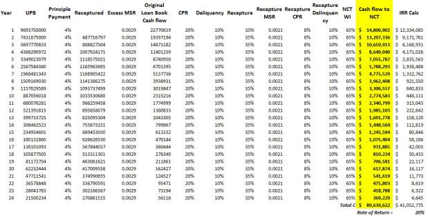 The first point illustrated by the model is how much the cash flow changes from year to year. This is not a fixed return investment. The cash flow from an MSR is heavily weighted to the front end. The Year 1 and Year 2 cash flow decrease substantially as you move forward. While its always good to get paid out quickly, it also means that we have to be careful with respect to what we define as a sustainable dividend based on that cash flow. I’m not entirely sure whether a REIT like Newcastle has any say in the matter (they may just have to distribute 90% of their cash flow irrespective of how that cash flow stream may decline in the future, I’m not sure, I haven’t done the work to understand the rules of the REIT structure in the US carefully). But if Newcastle pays out the full $14M+ in the first year, the cash flow stream is going to decline substantially in subsequent years and Newcastle is going to have to find equivalent return investments to sustain that cash flow.