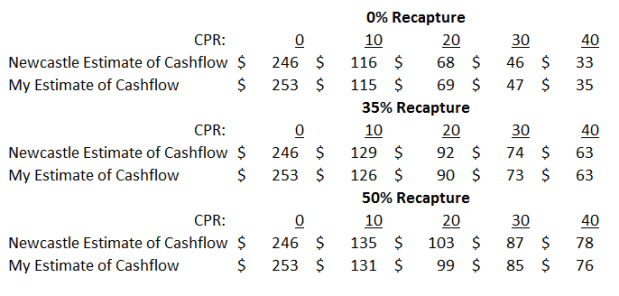 I made a comparison of the cash flow estimated by my model for each of the scenarios that Newcastle illustrated on Slide 8 of their presentation. My results along with the original Newcastle estimates are shown in the table below. All amounts are in millions.