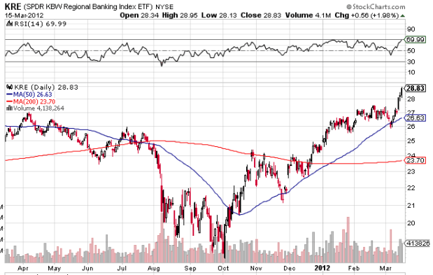 On Tuesday the financials broke out and that breat out has continued through the week. A quick look at the KRE shows that the trend has been up since the end of December and that the move this week took them decisively above the July-August levels just before the break down occurred.