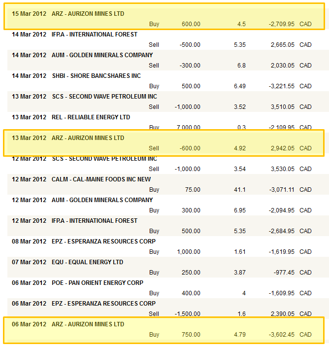 Over the past 6 months I have (somewhat unintentionally) been swing trading Aurizon Mines. I hold a core position but around that position I buy more at or just under $5 and I sell what I buy at around $5.75 or $6. It worked well a couple of times last year, however this year not so much. The stock stalled out a few weeks ago at $5.50, it didn’t stay there long, and I ended up jumping out of some of my non-core position in the $5.30 range. After that I sat as a bagholder with the rest, watching the stock tumble below $5.