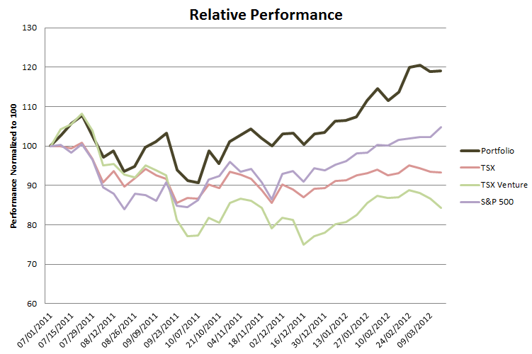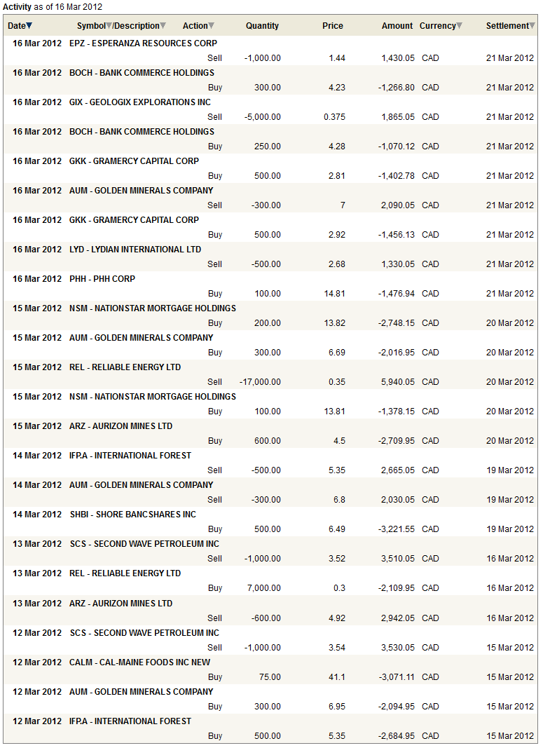 So as not to get too far on margin I reduced a number of my gold stock and oil stock holdings commensurately. I am out of Second Wave entirely. Likewise, after the takeover bid from Crescent Point I sold my entire position in Reliable Energy. I reduced my position in three gold stocks: Esperenza Resources, Golden Minerals, and Lydian International. With the economy continuing to move forward, and especially with the move in the bank stocks this week, I just think there are better places to put capital than gold stocks right now. However, that remains with exceptions: Atna Resources for instance, which I expect to appreciate significantly from here.