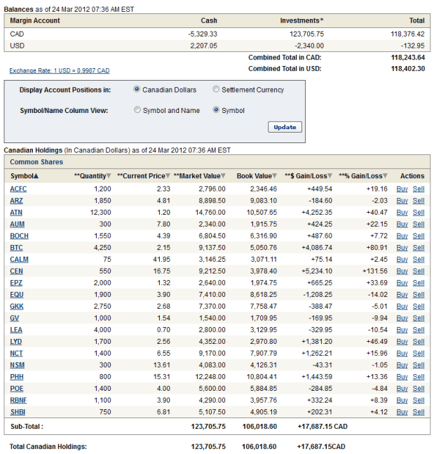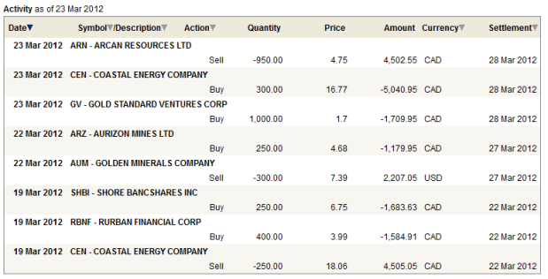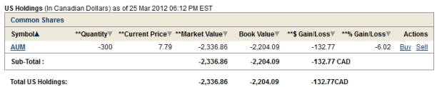 I think there is a gliche with the RBC Practice Account because somehow I sold Golden Minerals (AUM) on Wednesday and ended up with a long AUM in Canadian dollars and a short AUM for the same amount of shares in US dollars on Thursday. I am hoping the trade resolves itself (in my actual accounts this sort of matched trade in the wrong currency would automatically resolve) but if it doesn’t I will attempt to clean it up myself. I wanted to point it out because my current portfolio composition looks a little odd as a result.
