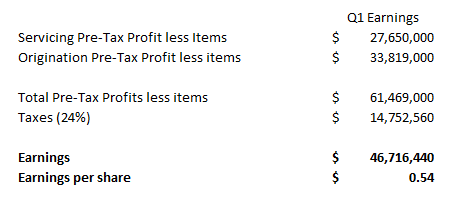 The point of going through all of the above was to determine which of the line item revenues and expenses should be included as part of operating earnings. To review, I concluded that I would ignore the expenses due to the Newcastle arrangements, the fair value adjustments to the servicing portfolio, the capitalized portion of the origination, and the fair value adjustment to the originated loans that have yet to be sold to the GSE’s.