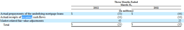 The fair value of the mortgage servicing portfolio is affected when the loan is repaid because the value associated with that particular mortgage servicing right gets written off. The value of actual receipts of cash flows could be considered to be the basic amortization of the mortgage servicing right. The Market-related fair value adjustment is the adjustment to the value of each servicing right based on the likelihood it will prepay in the future or not. It’s the market-related fair value adjustment that we want to remove from the earnings calculation. Unfortunately Nationstar doesn’t break out the fair value adjustment between these items so its impossible to know how much of the adjustment is market related and how much is due to prepayments and recurring cash flow and how much is the fair value adjustment.