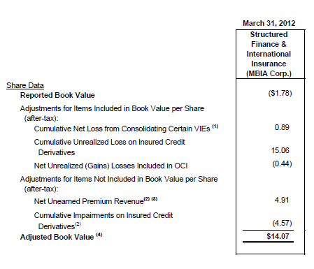 As I already mentioned, the outcome of the put-back litigation will essentially determine whether there is value in MBIA Corp (the financial structuring wing) or not. If the outcome is favorable, the value is not inconsequential. Below is the adjusted book value of MBIA Corp. Adjusted Book Value accounts for all expected loss payments by MBIA, all expected premium receivables, and most importantly, the $3.1B that MBIA thinks it has coming back to them from litigation.