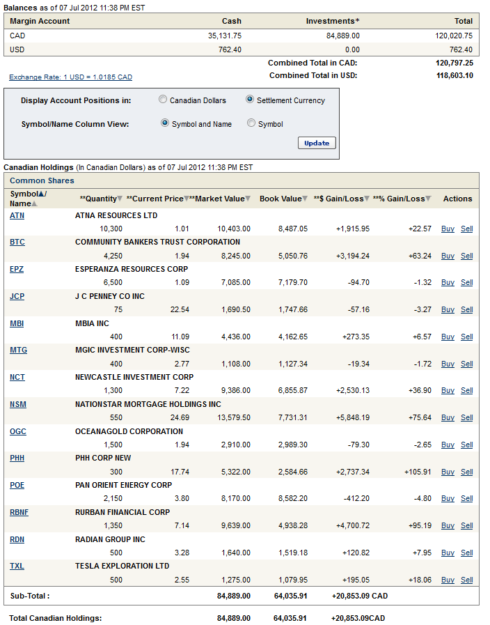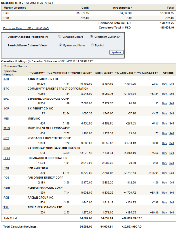 There were a couple of positions that had big moves over the last few weeks. The first is Nationstar Mortgage Holdings (NSM). Nationstar is now more than a double from my original purchase and up over 75% for the entire position. Both Nationstar and Newcastle Investments (NCT) have been strong of late, and I think that’s likely due to the expectation that they will win the ResCap bidding war. According to an 8-K filing that Nationstar made on Thursday, their bid for ResCap was raised $125M. At this point the risk is that they don’t win the bid and that the stock falls back. However, I bought the stock well before the Rescap sale and I still believe that there is some upside even ignoring Rescap. Even without the Rescap deal, Nationstar has grown substantially through the purchase of the Aurora portfolio and Bank of America’s servicing assets. I’m reluctant to sell any shares yet.