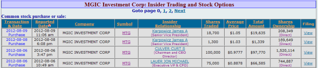 On one last note, I was encouraged to see that both Radian and MGIC management bought shares over the past few weeks (with MGIC being the more important of the two in this respect). These purchases, which are not insignificant and show that management has not thrown in the towel yet.
