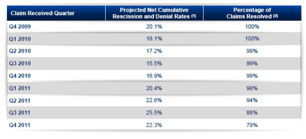 The second column shows rescissions and denials as a percentage of total claims for the period. The third column shows the percentage of claims that have been resolved from that quarters bucket.