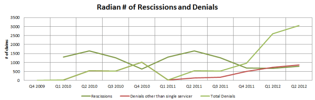 The above chart is similar to the one I showed earlier. It illustrates the number of rescissions and denials at Radian by quarter, but with the difference that now the denial activity has been broken out a bit further. Beginning with the Q2 2011 quarter, Radian further delineated its denials between those that have come from a single servicer, and those that have come from everyone else.
