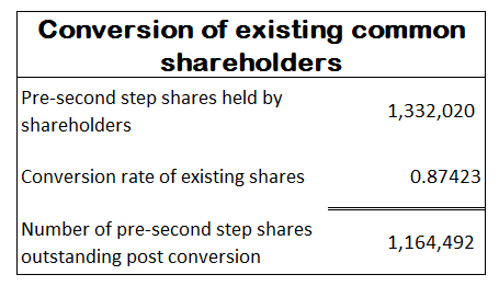 To keep the ownership percentage of existing shareholders at 45%, existing shares were converted at a rate of 1 existing share to 0.87423 new shares.
