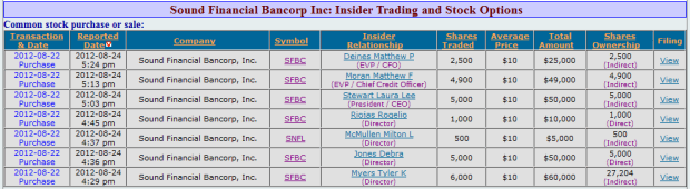 Over the last couple of weeks I have built a position in a recent mutual holding company conversion called Sound Financial. It took some time. The stock trades 10,000 shares on a good day, so you have to pick and be patient and don’t flood the bid.