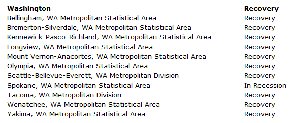 Looking at the broader economy in Washington state, I think the generalization that could be made is that things are picking up. Economy.com has all Washington regions except for Spokane in “Recovery” mode according to their Regional Recession watch.