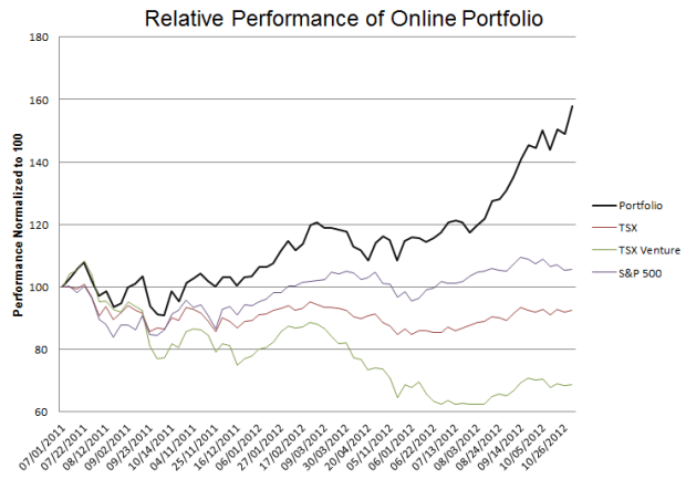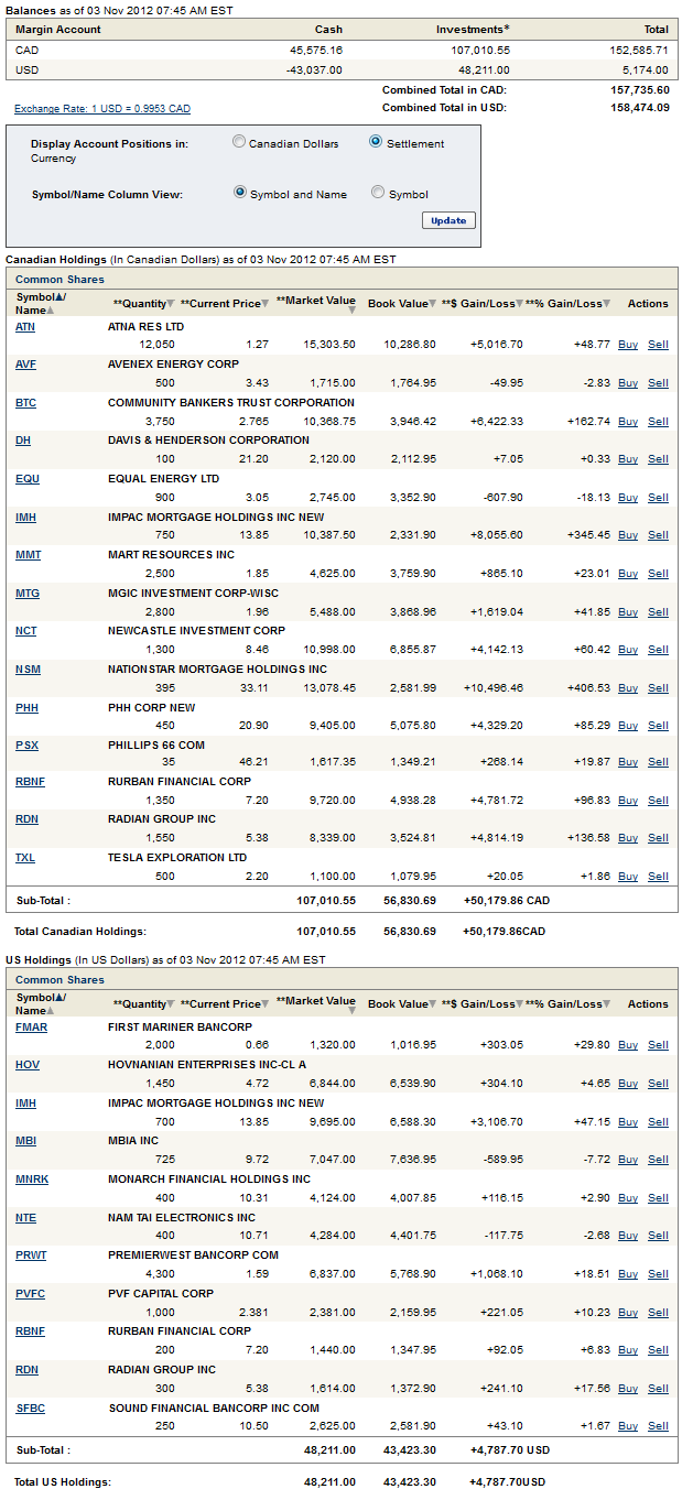 As for the idea of gold itself, it is an interesting case of what to do when an idea makes sense, but simply isn’t working out. As much as I want to believe that quantitative easing throughout the US and Europe should mean higher gold prices, it isn’t happening. Whether that is because Indian demand is slow, because the US economy is recovering (though you’d hardly assume that from the stock market these days), because Romney is going to be elected or because of some other factor, I will leave it to others to pontificate. I just know that what should be happening hasn’t, so I obviously don’t understand all the factors at play. So I’m going to sit this one out until I get the response to confirm the thesis.