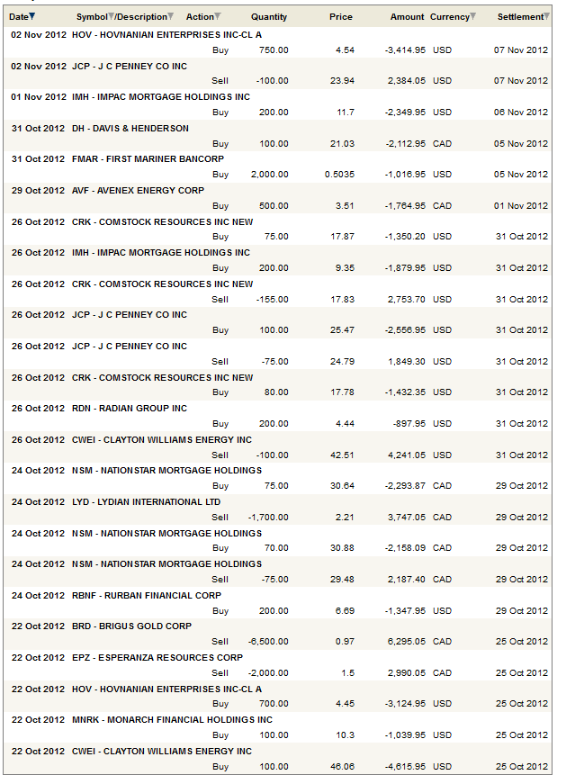 I have a write-up of my reasons for getting into JC Penny in the first place which I never published because I just couldn’t get comfortable enough with the idea to make it a decent sized position (if you want a copy, just email me). This is mostly because I don’t understand the retail business all that well, and so though I expect that in the long run JC Penney puts together a strategy that leads to profitability, I’m not really sure what happens in the mean time. With the Christmas season approaching and with some other new stocks appearing more clear to me, I decided to let this one go for the moment. However I expect I will be revisiting the story before too long.