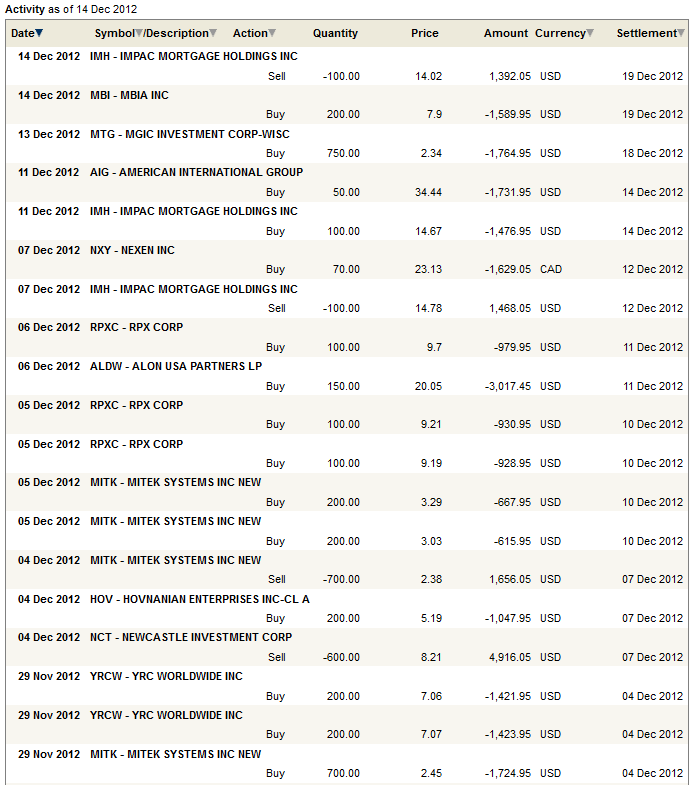 But keep in mind that this was a $2.50-$3.00 stock prior to when the second quarter Freddie Mac dispute was announced. And it was only last April that this was a $5 stock. With Freddie Mac ending in a positive resolution, and with the housing market continuing to show life, MGIC continues to work past its legacy issues. If (and this remains a big if) the fiscal cliff is avoided, MGIC could end up being one of those companies that shoots higher as a result. Of course if it isn’t, and 2013 becomes the year of the recession, well… I’m going to be doing a lot of fleet footed portfolio changes early in the new year.