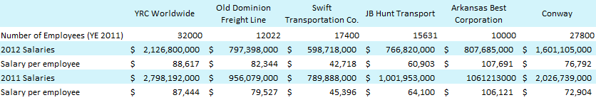 You can see just how out of whack the pay structure is at Arkansas Best when compared to other companies. I have created a simple table of the Salaries, Wages and Benefits on a per employee basis for a number of players in the industry.
