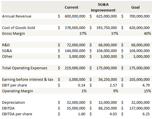 To help put that goal into perspective,the company has about 22 million shares outstanding, so they are suggesting that they can improve their operating margin by nearly $2 per share simply through SG&A improvements.